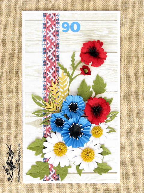 Suvel on väga nõutud rahvuslikus stiilis ja lihtsate eesti lilledega kaardid. Kaardi jaoks sooviti tugevat linase kangaga kaetud karpi. Nii kaardil kui karbil kasutasin ühendavaks lüliks rustikaalset jämedakoelist paela, mille servas õrn pits. Kaardile said minu juba traditsioonilised põllulilled, aga karbile ma neid õrnu paberlilli seekord ei tahtnud panna. Karbikaanele leidsin puidust laserväljalõike. Tulemus sai lihtne, aga ilus.